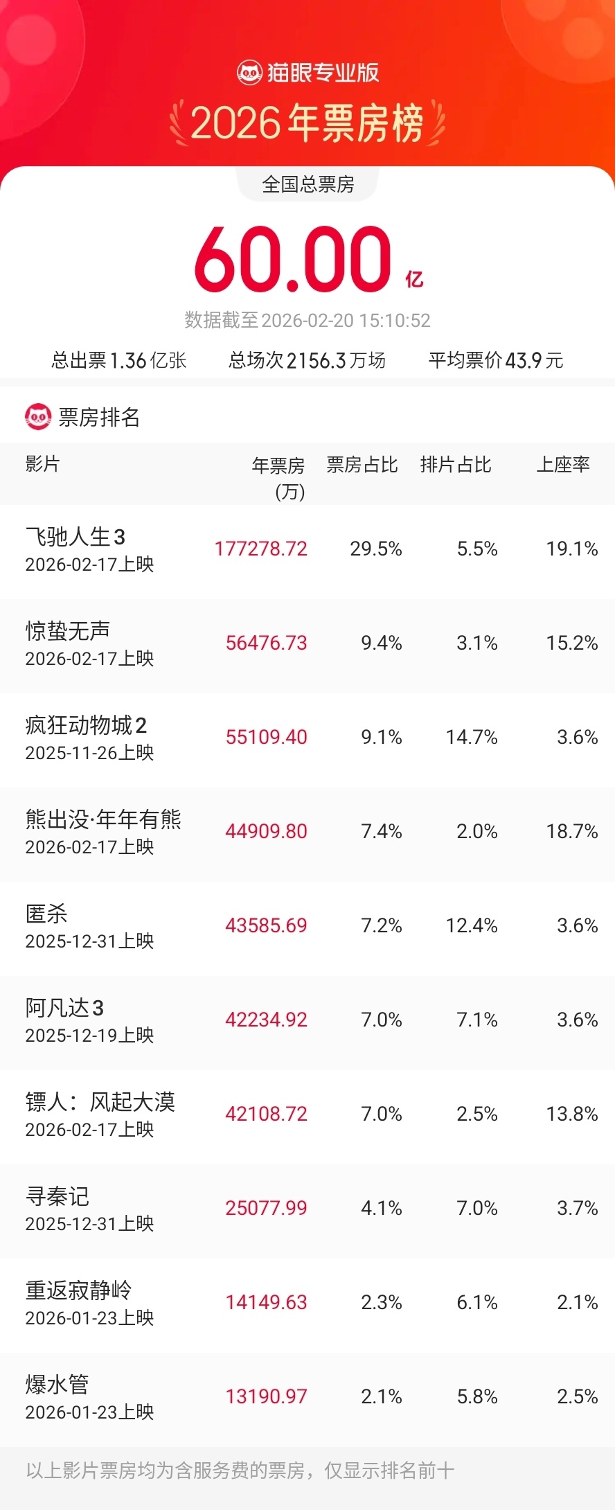 央广网北京2月20日消息(记者 宋雪)据猫眼专业版数据,截至2月20日15时24分,2026年春节档档期总票房(含预售)破35亿,《飞驰人生3》《惊蛰无声》《熊出没·年年有熊》分列前三位。此外,截至2月20日15时10分,2026年年度总票房(含预售)突破60亿。《飞驰人生3》《惊蛰无声》《疯狂动物城2》暂列年度票房榜前三位。